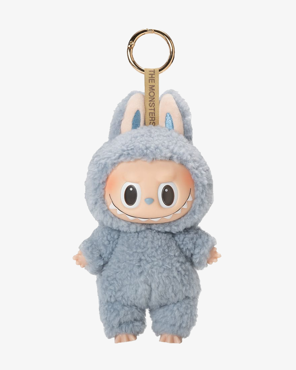 • Color & Design: bluish hue with Labubu’s signature features—wide grin, jagged teeth, huge eyes, rosy cheeks, tiny feet and hands, and oversized ears